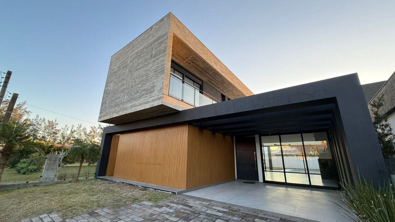 Sobrado com fachada imponente Novo nunca habitado 4 suítes Living integrado Entrada de serviço Espera para split Garagem para 2 carros lavanderia separada Espera para gás central Piscina de concreto XANGRI-LÁ/RS