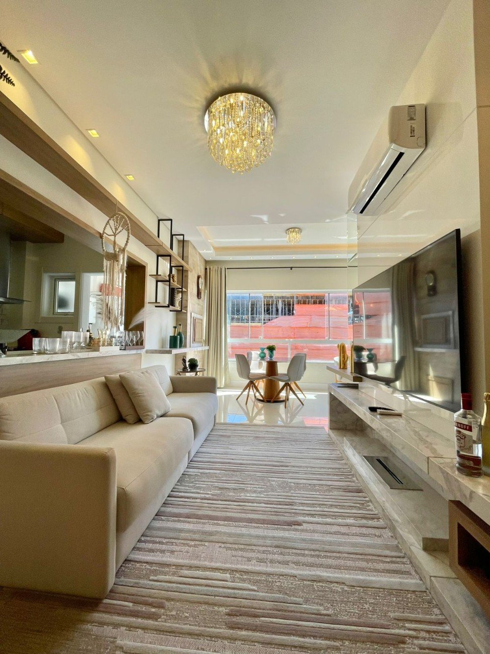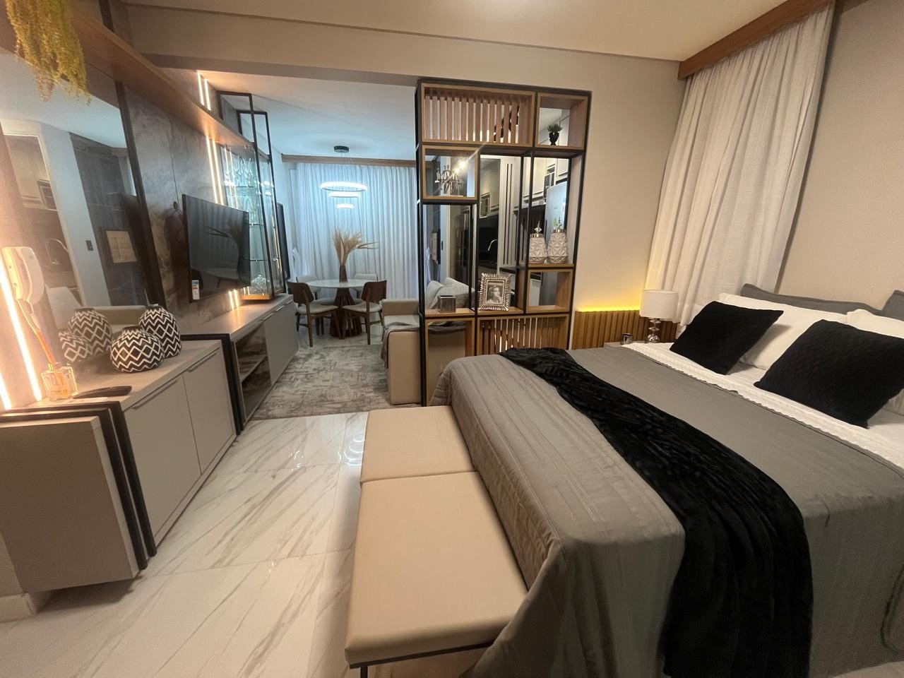 Este loft finamente mobiliado e decorado combina sofisticação e aconchego em um espaço bem planejado e iluminado. A sala traz revestimento em pedra, marcenaria sob medida e iluminação indireta que valoriza a decoração. A cozinha compacta e funcional conta com acabamentos modernos e detalhes em palhinha. O quarto é aconchegante, com armário espelhado e roupa de cama elegante, enquanto o banheiro segue uma linha clean, com bancada em mármore e iluminação embutida. Cada detalhe foi pensado para oferecer conforto, estilo e praticidade.