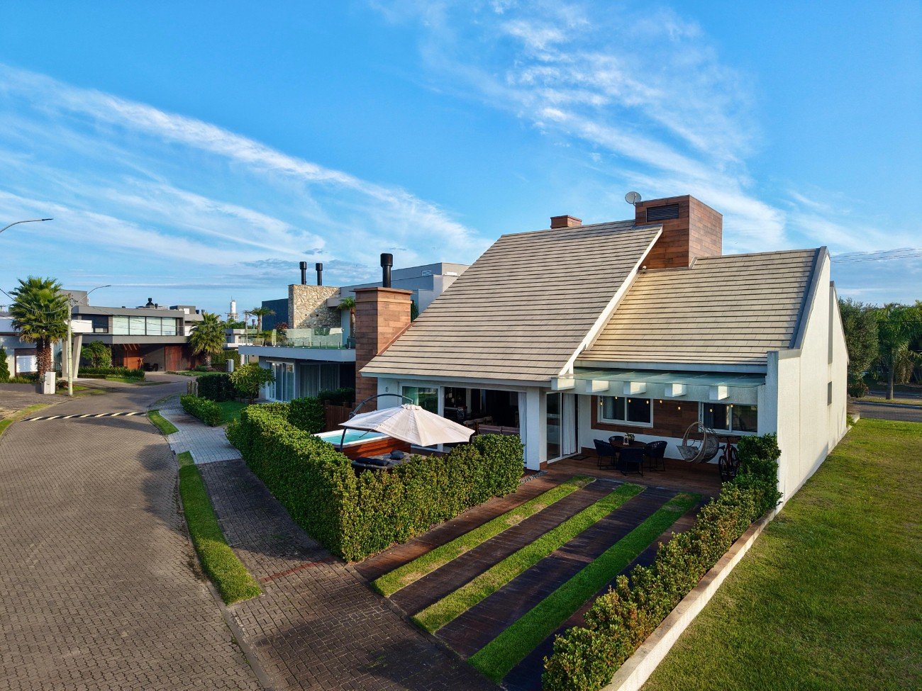 Casa com 262 + 30 coberta depois habite-se M² Terreno 492 M² 04 Suítes individuais térreas Mobiliada 2 frentes Spa com hidromassagem Lavabo Pé direito alto Mezanino no 2º andar com ampla sala de tv Living integrado Excelente iluminação Natural Infra completa Portaria 24h
