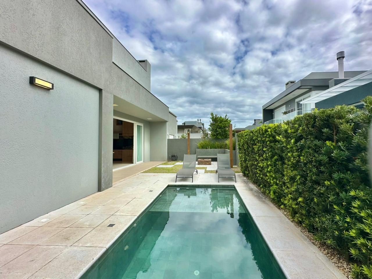 No sofisticado condomínio Condado de Capão, esta residência de alto padrão oferece conforto, elegância e uma localização privilegiada. Com 150 m² construídos em um lote de 300 m², a casa está situada de frente para a avenida principal e a poucos metros do clube social, em uma posição leste que privilegia a iluminação natural e a ventilação. O imóvel conta com três dormitórios, sendo uma suíte, e um amplo living integrado que valoriza o convívio e a sensação de espaço. Totalmente mobiliada, decorada e climatizada, está pronta para morar com requinte e praticidade. Destaque para a área externa, que convida ao lazer com uma piscina aquecida, deck em madeira nobre, pergolado e um belíssimo paisagismo com sistema de irrigação automatizada. A residência ainda dispõe de abrigo para carro, esquadrias em PVC, piso em porcelanato e acabamentos que refletem o cuidado em cada detalhe. Uma excelente opção para quem busca qualidade de vida em um dos melhores condomínios do litoral.