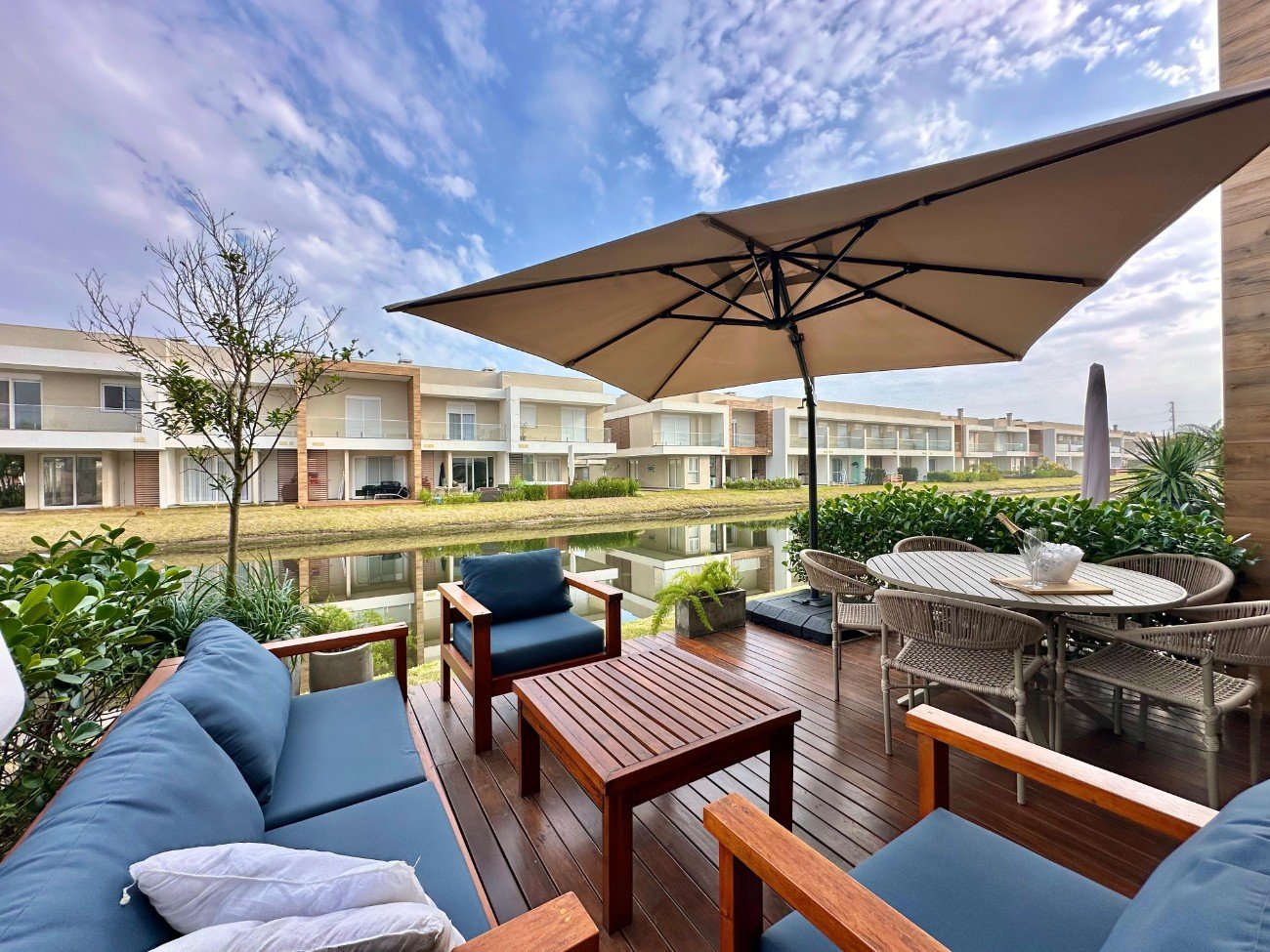 ?Casa com 143,33 M² ?Mobiliada e Decorada 3 dormitórios (01 suíte) Lavabo Deck Beira lago Lavanderia completa Living integrado Gourmet Churrasqueira Ar condicionado Split Condomínio Infraestrutura completa Piscinas,Salões de Festa + Gourmet + Academia + Praia Particular