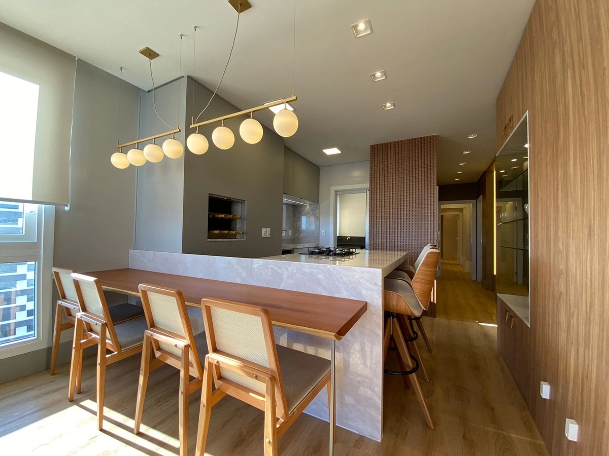 APARTAMENTO SACADA DE FRENTE Infraestrutura completa, próximo a todos os recursos da cidade Piscina aquecida, salão de festas e academia 1 Dormitório Banho social Mobiliado Living amplo de dois ambientes Sacada de frente com churrasqueira Cozinha Área de Serviço 56,72 M² área privativa; 01 box de garagem 14,58 M² 02 Elevadores Hall decorado Alto padrão Salão de festas Piscina coberta e aquecida Sauna Academia Salão de Festas Zelador permanente Portaria 24 h