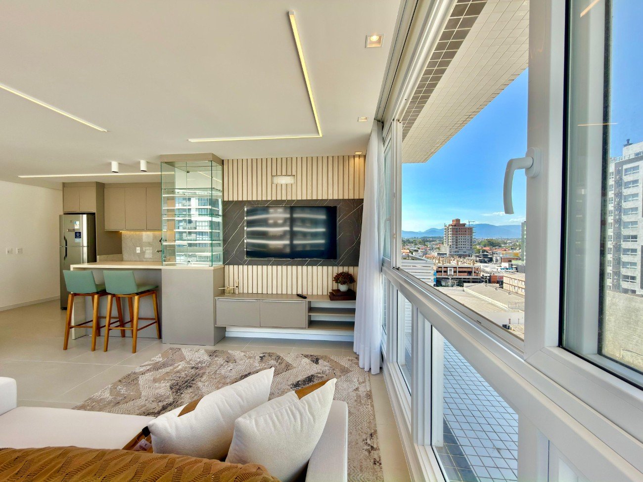 Apartamento composto por 02 dormitórios, sendo 01 suíte, com living para 03 ambientes, proporcionando excelente conforto e integração dos espaços. Possui vista eterna para avenida, serra e mar, sacada de frente fechada, cozinha funcional com churrasqueira, área de serviço separada e banho social. Imóvel com planta bem distribuída, contando com 01 box de estacionamento e depósito privativo. Edifício de alto padrão, com 02 elevadores, hall de entrada decorado, salão de festas completo, piscina aquecida e academia equipada, oferecendo infraestrutura ideal para lazer, bem-estar e praticidade no dia a dia.