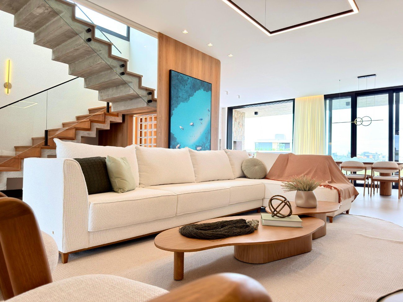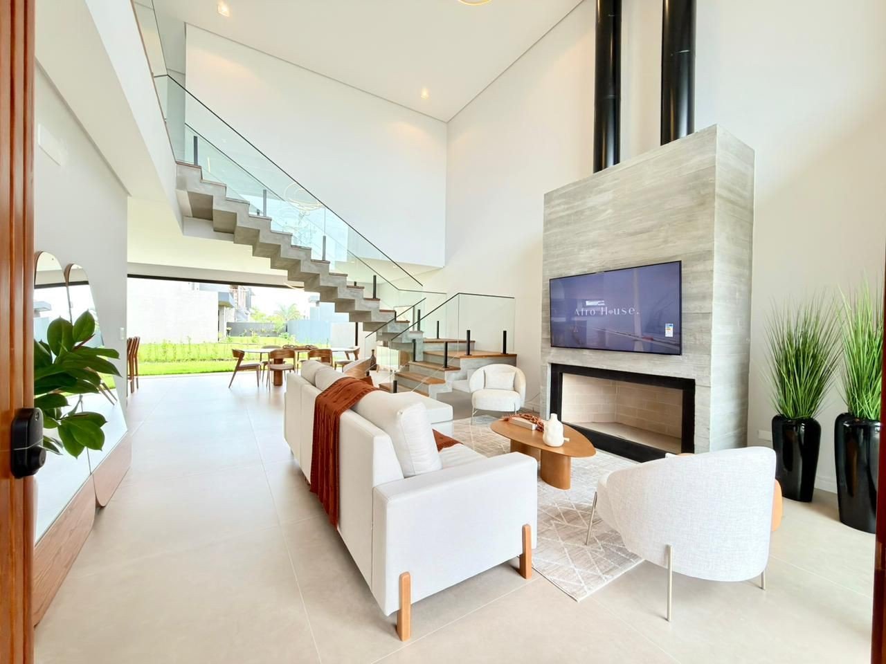 Casa com 220 m² Mobiliada Decorada Pé direito Duplo 4 suítes – Sendo 1 no primeiro andar e 3 no andar superior Suíte Master com 22m2 + Banheiro + Sacada Sala de Estar com pé direito duplo e com Lareira em concreto aparente Sala de Jantar com quase 40m2 de frente para o pátio dos fundos e sol Norte Cozinha com Ilha Gourmet que integra com a Sala da Jantar e com a Churrasqueira Lavabo na parte Interna Lavabo na parte Externa que atende tando a churrasqueira quanto uma eventual piscina nos fundos Lavanderia separada da cozinha Deposito com entrada separada do resto da casa Fachada em Concreto Aparente, Brises de Madeira, Revestimento de Pedra Moledo, Nichos de Led Outros Diferenciais: Escada em concreto aparente e reviramento de madeira nobre Esquadrias Piso Teto em todos os cômodos da casa Persianas elétricas e com mosqueteiro nas suítes Banheiros 100% revestidos e box blindex Porta de madeira revestida de com acabamentos de Brise